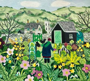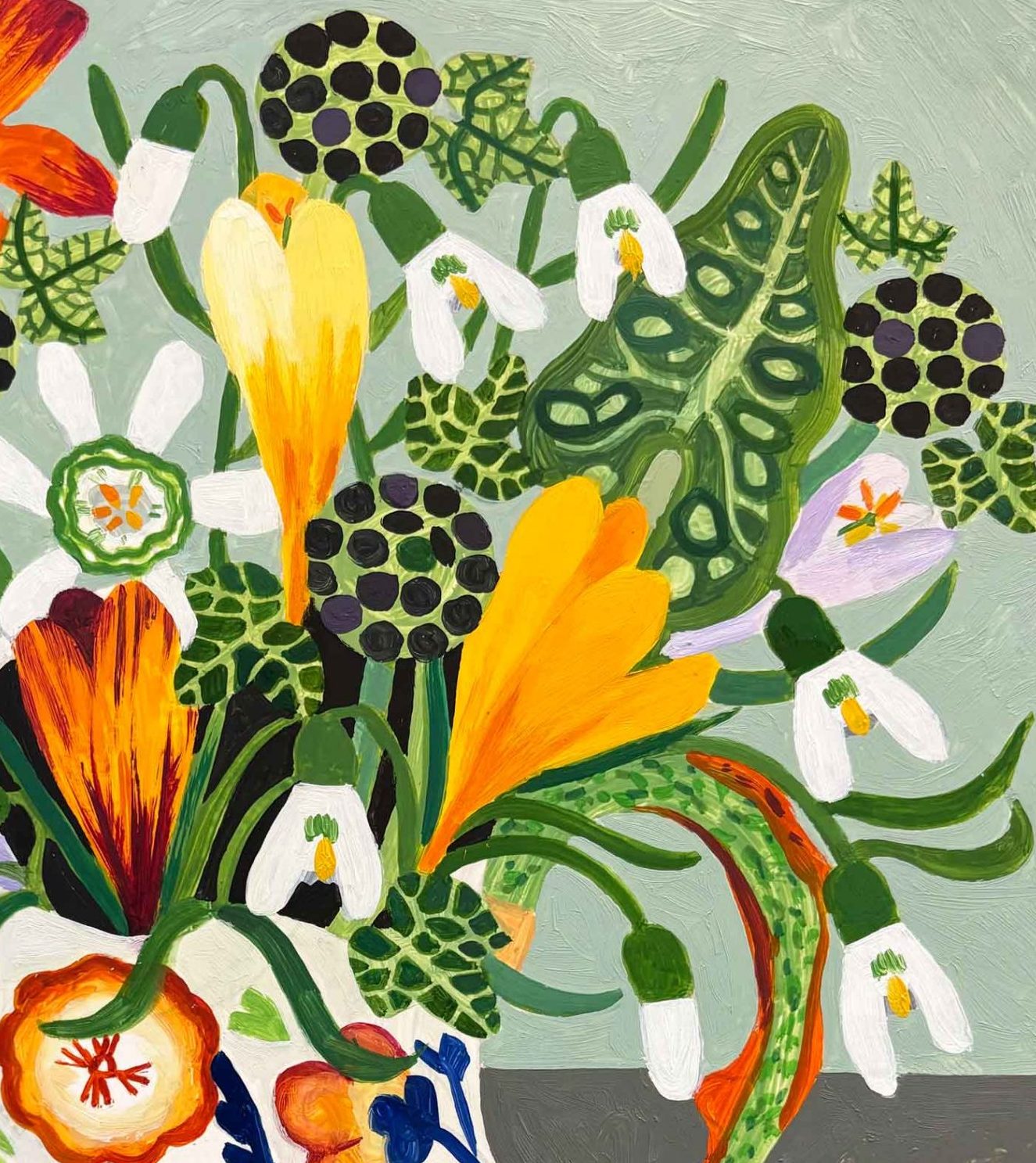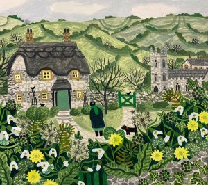 Similarly her landscapes observe the pattern and texture of the countryside around her home. She paints features left by the working of the land, punctuated by seasonal land marks, such as skeletons of trees in winter or hedgerow flowers in summer. Detailed foregrounds of vibrantly coloured berries or hips, delicate snowdrops or cow parsley lead the eye into an intimate portrait of the Dorset landscape.