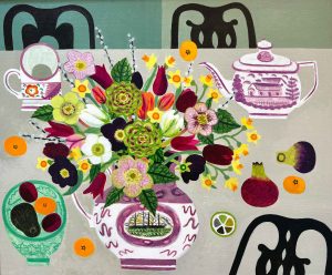 Each of Vanessa’s still lifes observes the simple beauty of everyday objects – a moment captured in time. A vase of garden flowers, a bowl of lemons (their acid yellow placed against the deep magenta plum), a striped shell – each is placed deliberately within the framework of the painting combining muted subtle colour with jewel-like accents.