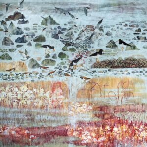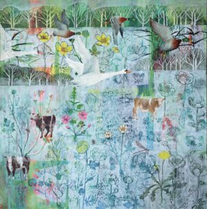 Dawn Stacey’s dreamlike landscapes are painted in acrylic, allowing her to work quickly, building layer after layer of detail and colour. The paintings are usually based on still life or the landscape in its different seasons, evolved from walks or travels.