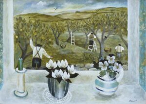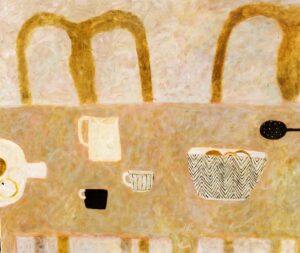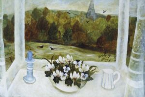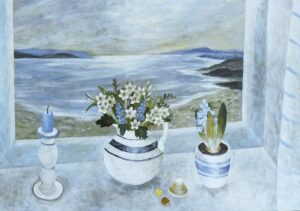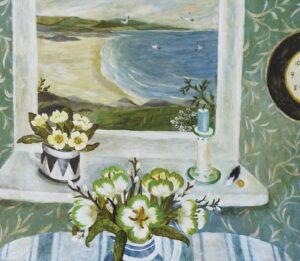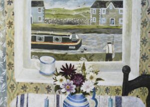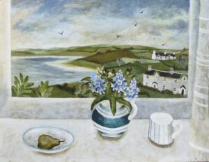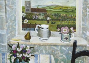 A recurring compliment heard in the gallery is “these are optimistic paintings”. Sarah imbues her work with freshness and light. How this is achieved is partly subconscious, but she is also aware of the meditative process involved in her muted, abstracted still lifes. Motivated by artists such as Breon O’Casey whose mantra was to keep “taking away”, until, in Sarah’s words, there is just a “gentle hum, a flickering of colour”. A simplicity. This is echoed in the still life window views, where narrative elements such as gardeners and sailors, or inanimate objects like a teapot on the windowsill, hint at an ongoing story. Yet, it is enough just to be there, to lose oneself in the moment, “to be level with ordinary experience”.